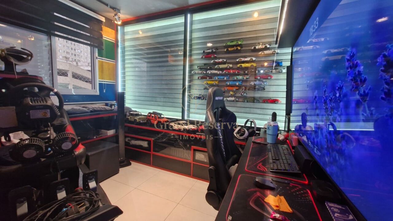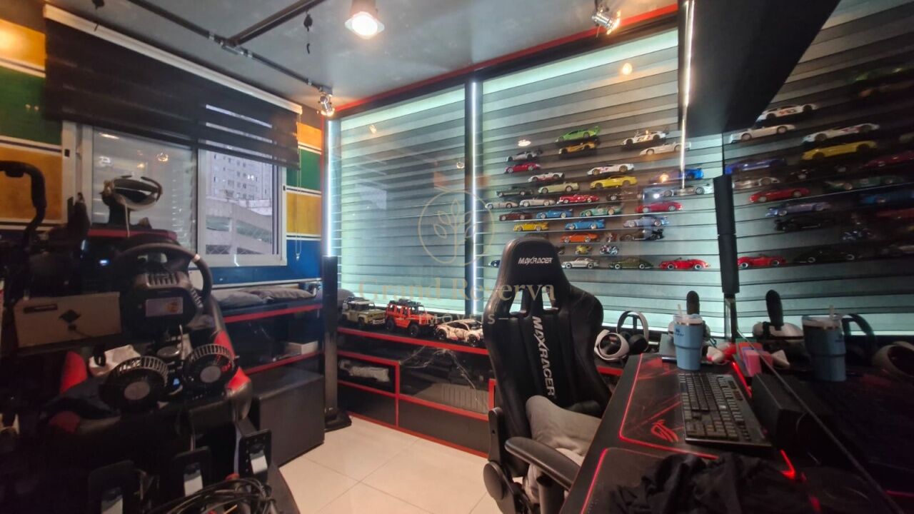 Dormitório principal com armários planejados e segundo dormitório montado para um escritório, todos com home theater já instalado.
