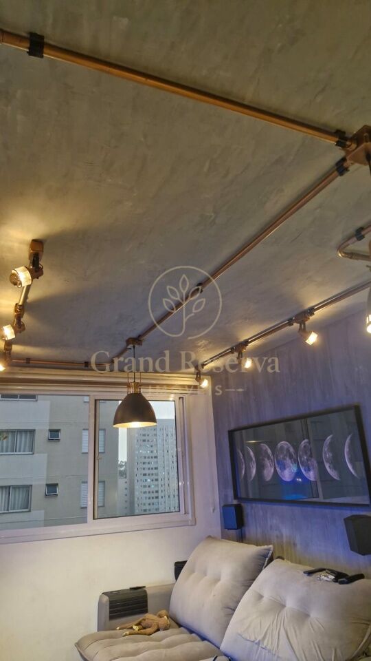Sala para dois ambientes, teto com design industrial contemporâneo, em cimento queimado, com tubulação metálica rosé exposta e sistema de iluminação com spots direcionáveis, um visual moderno e sofisticado.